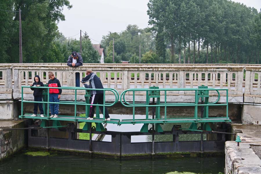 The rest of the cruise passed in a dismal drizzle with each lock-keeper asking hopefully if we would be stopping before the next lock. At Sailly the lock is still operated manually, and the student attendant had a couple of even younger assistants to help him, all standing patiently in the steady rain. This was a great relief to the crew who had feared being pressed into manual labour for some rain-soaked winding. The young lock keeper assured us that the best moorings for Corbie were before the next lock and persuaded us that we wouldn't need it that evening - given that we wouldn't arrive until close to their 6pm closing time it was probably good, if slightly biased, advice.