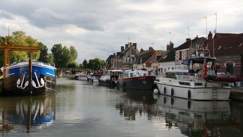 By the time we had received our scheduled fuel delivery, it was nearly midday before we got away from Chauny, but the improved weather which had been forecast had still not really arrived. In our mast-down state we are very vulnerable to rain showers, and it wasn't long before we got our first soaking, which of course coincided exactly with our arrival at the first lock. On this leg we were to cruise west along the Canal lateral à l'Oise, as far as Pont l'Evêque, and then turn north on the busy Canal du Nord, as far as its junction with the Canal de la Somme. When we had first planned to cruise via the Somme we had envisaged taking the Canal St Quentin and joining the Somme at the St Simon junction. However, the more recent of our cruising guides pointed out that this 15km stretch between the Canal St Quentin and the Canal du Nord has in fact been closed since 2006.