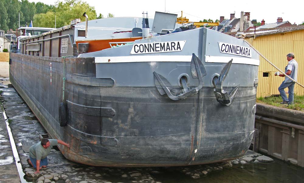 After our second lock (and soaking) we arrived at the village moorings at Pont l'Evêque. At the junction with the Canal du Nord and the busy route to the l'Oise, this is a popular stopping point for barges, and the halte plaisance shares a sheltered inlet with a barge dry-dock. There was a steady procession lining up for the opportunity to peer at their underparts, and tackle the sides with roller paint brushes. With more rain looking likely we decided it was worth investigating and opted to leave the Canal du Nord for another day.
