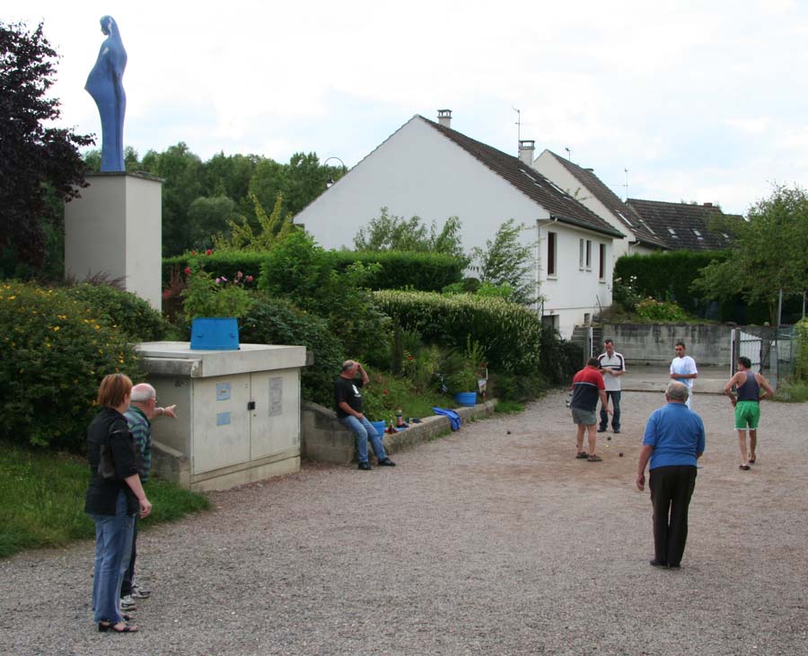 Entertainments in the village are limited to the annual boules contest, which was to take place that Saturday, for which the locals were in strict training. With the only boulanger in town away on holiday for three weeks, the best option for shopping was a 2km bike ride to the Auchan hypermarket on the other side of Noyon. This offers a fun-filled outing for all the family and, as ever, was packed out with eager shoppers. After the mainly uphill cycle our first priority was the cafe du visite, where we bumped into the crew of 'Beats Working', one of two other English boats moored alongside us, who had obviously had a similar idea.