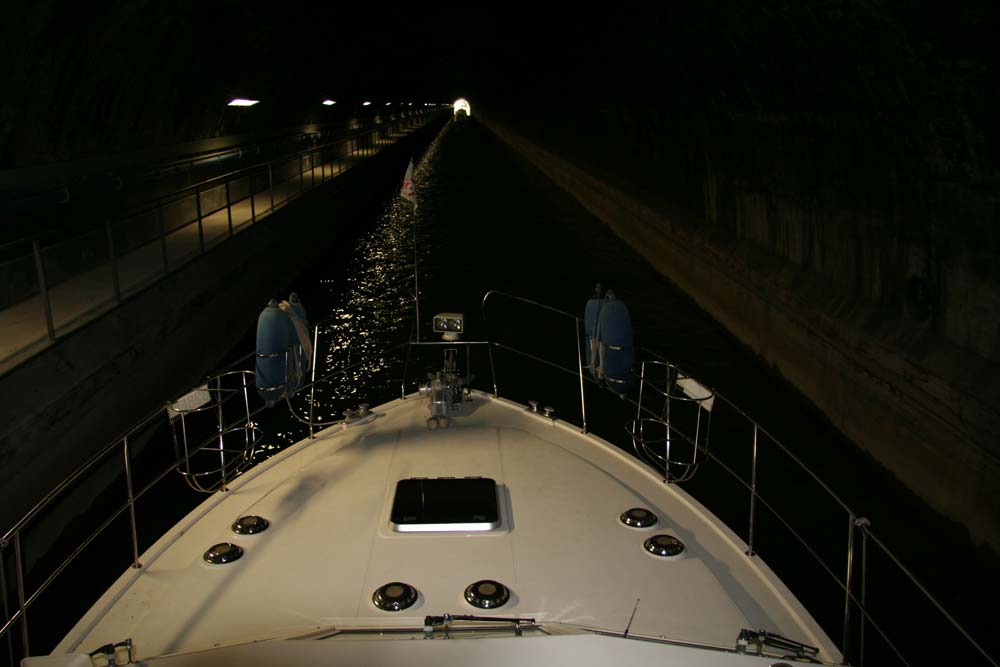 Having made our decision to leave Paris today, we made a prompt start and were ready for our pre-arranged 9am lock, despite the odd spots of rain threatening what would be a mast down cruise. We slipped confidently under the bridge pipework with just a few inches clearance and locked down into the Seine to continue our way upstream. Boats are still in the suburbs of Paris when they turn east off the Seine to join the Marne, and after only the second lock we had our first experience of French tunnels, although with 5.6m of headroom and fluorescent strip lighting, the 600m stretch presented little challenge. The Marne is a wildly meandering river, and many of the more tortuous loops have been bypassed by canals and tunnels, which cuts the cruising time to a very manageable four or five days.