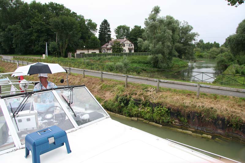 As well as the locks and tunnels, there were numerous fixed bridges to negotiate, so we were kept busy measuring the heights and taking photographs for our logs. Occasional rain showers made us wonder whether to stop off at one of the many mooring opportunities en route, but we were rather hoping to make it to the cathedral town of Meaux, and as the temperature was still warm, despite the showers, we continued on.
