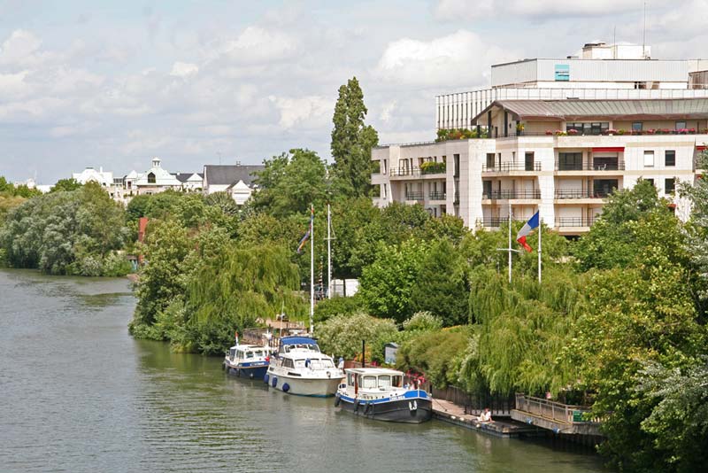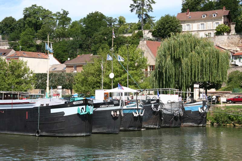 With our first guests arriving in Paris in less than a week, we decided we should probably make some efforts to get there, and decided to move on today, heading for the good-sized halte fluviale at Rueil Malmaison. The first part of the passage was through Conflans-Ste-Honarine, where as usual there were numerous barges permanently or temporarily moored waiting for work. The following weekend was to be their major annual festival, Pardon des Batellerie, so it was likely that some were starting to gather to secure the best places. As we had now passed the confluence with the L'Oise which links the Seine with the north east part of France, and from there with Belgium and Holland, we started seeing many more Dutch motor cruisers, who obviously use this route to avoid making sea passages. Some seemed in a great hurry to make progress and we imagined they were probably trying to do the Seine in a fortnight - "wij moeten naar Paris gaan" - and get back to other commitments. We let them rush on ahead, not wanting to compete with them for moorings.