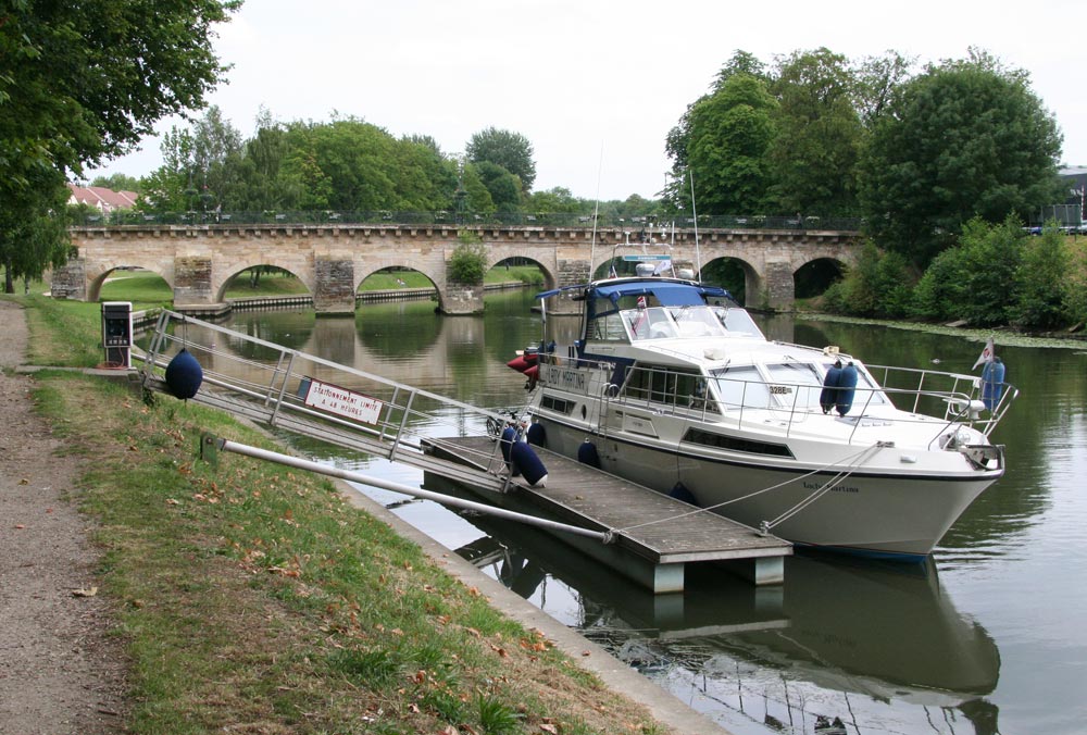 We noticed in the Navicarte a halte plaisance at Meulan on a backwater of the main river, which advertised water and electricity. Access is via the narrow channel between Belle Ile and Le Fort and although unmarked, the fixed bridges had only around 6m headroom, rather than the minimum 8.75m as found on the main channel. We found it to be a very serviceable pontoon, in a quiet riverside park, and best of all having arrived around lunchtime it was completely unoccupied. Although there were four (free) electricity points our boat took the entire pontoon, and we wondered why the town council had not made it slighter longer, having gone to the trouble to provide it at all. However, we had no complaints and we made an interesting sight for the local residents who came to the park to eat their sandwiches.