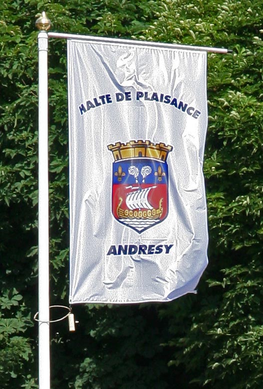 The moorings at Andresy are accessed from the upstream end of Ile de Nancy. A long stretch of low quay to the north is reserved for non-commercial visitors, and at the far end there is a single pontoon which is the most suitable spot for yachts. We had hoped to again find the advertised free water and electricity, but using our best diagnostic efforts we could only determine that no power was coming into the distribution board. As we were again alone at the halte we could employ the generator to make up for what the moorings lacked so were not too disappointed.