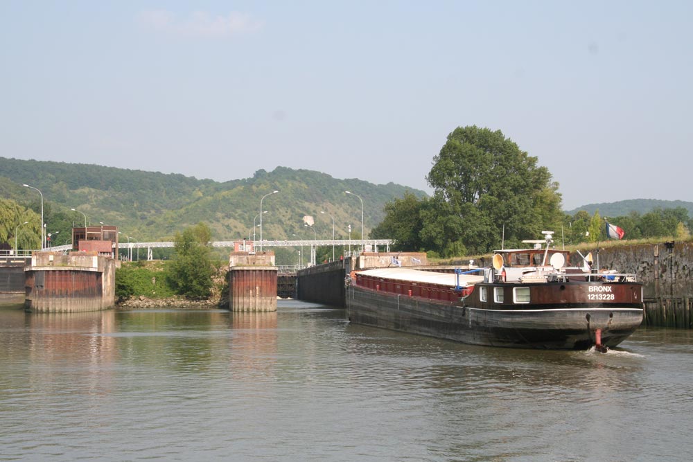 The river was quiet with only the occasional passing barge, and other than watching out for the shallower areas there were few hazards on our four hour trip. We arrived at Amfreville lock at 1800, allowing ourselves an hour to get through before their evening closure. We managed to avoid the worst of the green slimy walls although we had already resigned ourselves to sacrificing our fender socks to the trip. The lock-keeper had requested on our approach that he would like to see us in the office with our papers, but with anothr barge coming downstream and the end of the day approaching, he changed his mind and allowed us on our way.
