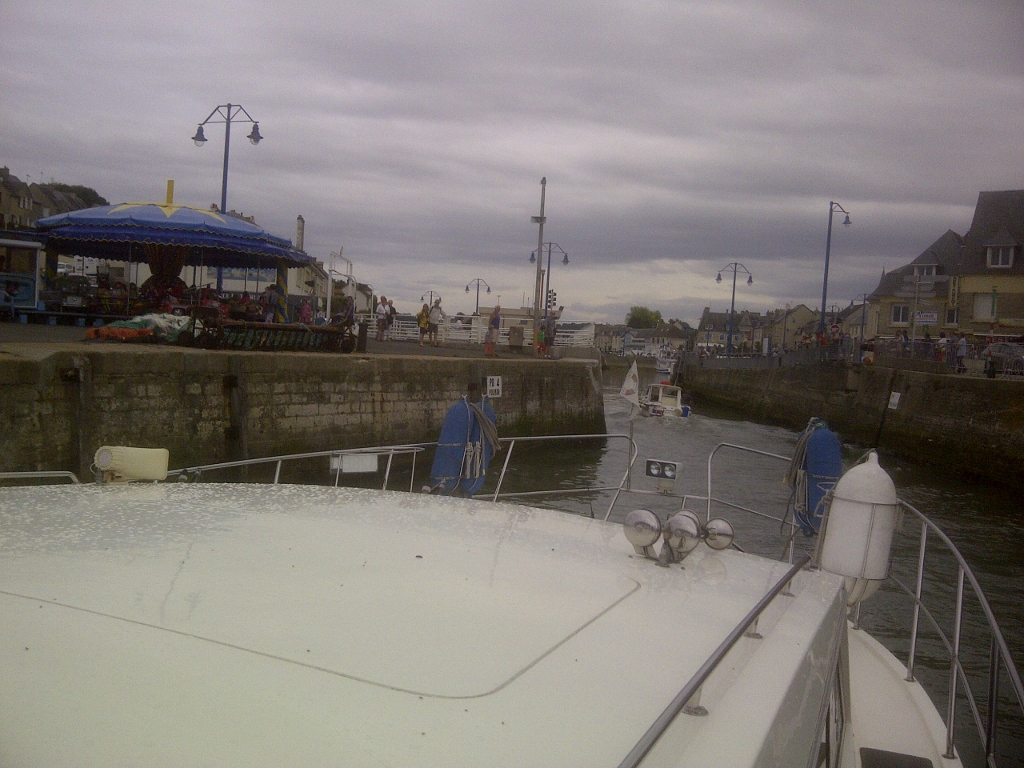 Another relatively short passage of some 1hr 45mins and 14nm promised not to be too difficult and so I hurriedly planned the route, waypoints and passage plan this morning. The tidal gate at Grandcamp opened at 1.40pm LT and it was sufficient to plan to leave around 2pm after the first exodus and, we did this within a quarter of an hour or so, which we achieved, despite the short notice and last minute plans. The cruise across the rocky plateau was taken in a north-eastery direction to go east of north cardinal No1 and that went well but then we encountered a metre swell from the last days stronger wind and had to ride that as we rounded Ponte du Hoc and the travelled along the Omaha beach. As we neared PortEn Bessin, the seas state eased back to slight and then smooth as we made our final approach, avoiding many small open fishing boats and crab pots as we went.