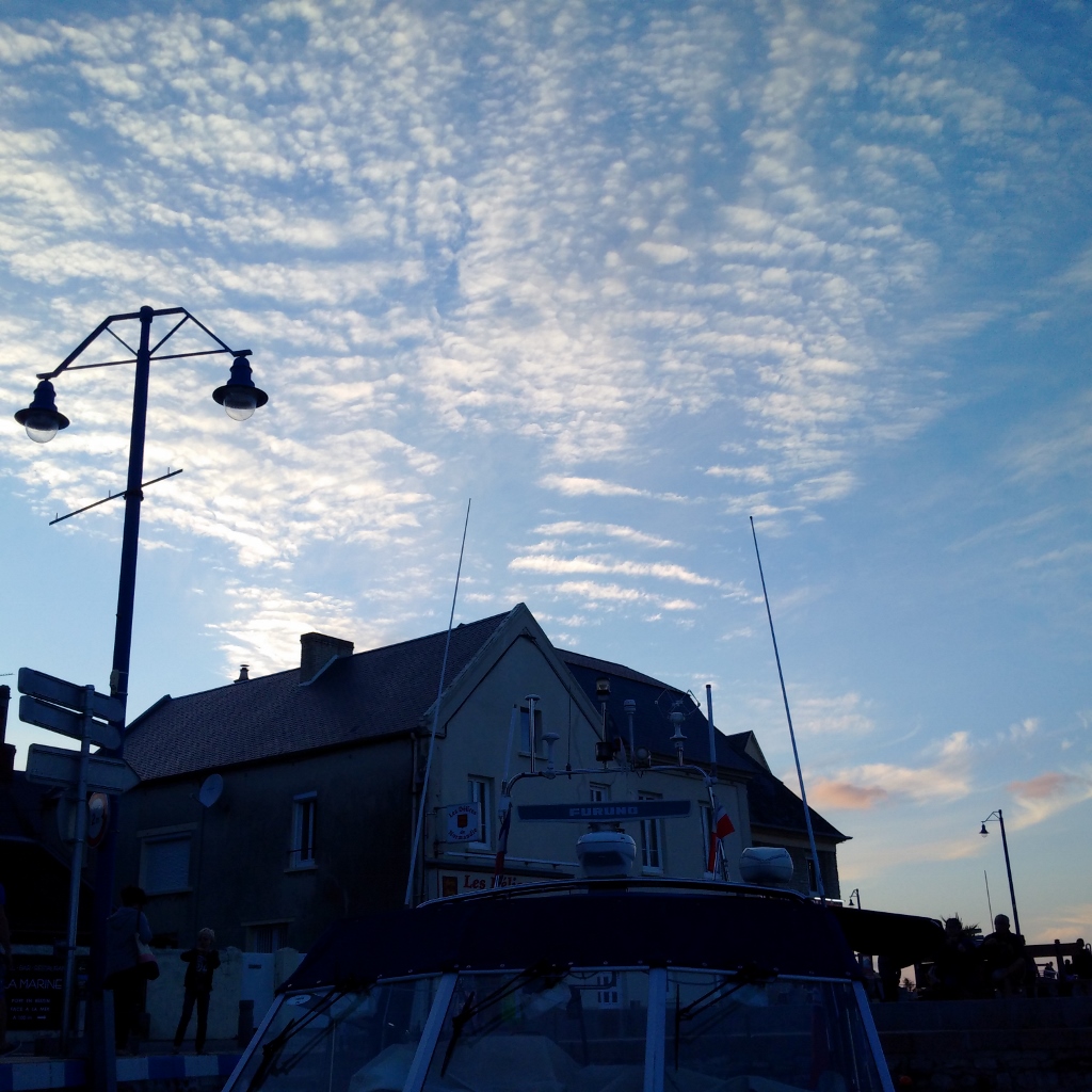 After a delightful couple of days in the centre of Port En Bassin, from which Kathleen had taken the bus rider to Bayeux to see the market and tapestries and I had caught up on some writing, we had both enjoyed the simple attraction of this honest seaside town and its fishing harbour, but it was now time to move on again. Scarily, the only time where the wind, waves and swell offshore would have decayed to make for a calm passage was very early on the morning of the Sunday and there was then forecast full gales later in the day. Studying the local meteorology for the correct timing was a necessity. Luckily, the local cafe/restuarant Rondponte IciWifi was within range of my WiFi bat and so this was made possible