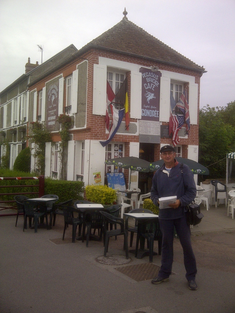 The arrival in the Ouistrehem buoyed channel was very straightforward and we followed a fishing boat into the small boat lock and tied up to vertical slip wires astern of him on the starboard side with two students helping us moor. Once through, we cruised along to the Pegasus Bridge and occupied my favourite mooring downstream on the true right bank and went ashore to have a delightful coffee, omelette and croissant breakfast at the cafe with Mme Arlette Gondree-Pritchet, surviving daughter of the family first liberated during the D-Day landings when she was then six years old. Once the next bridge transit 'convoy' arrived, we joined them for the rest of the canal trip up to Caen and arrived in the pouring rain to moor in exactly the same difficult berth that I had last occupied ten years ago!