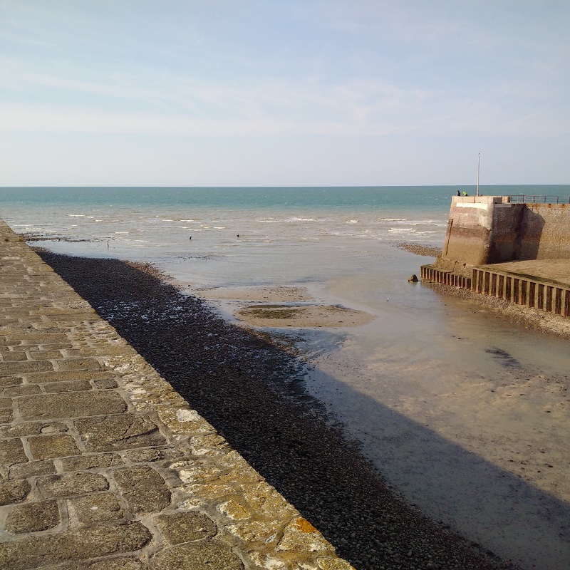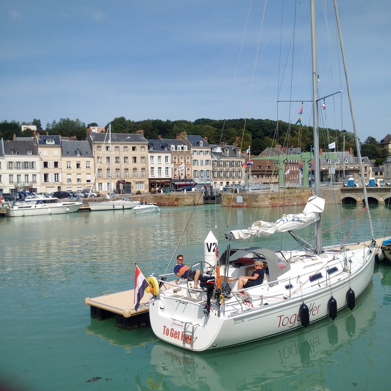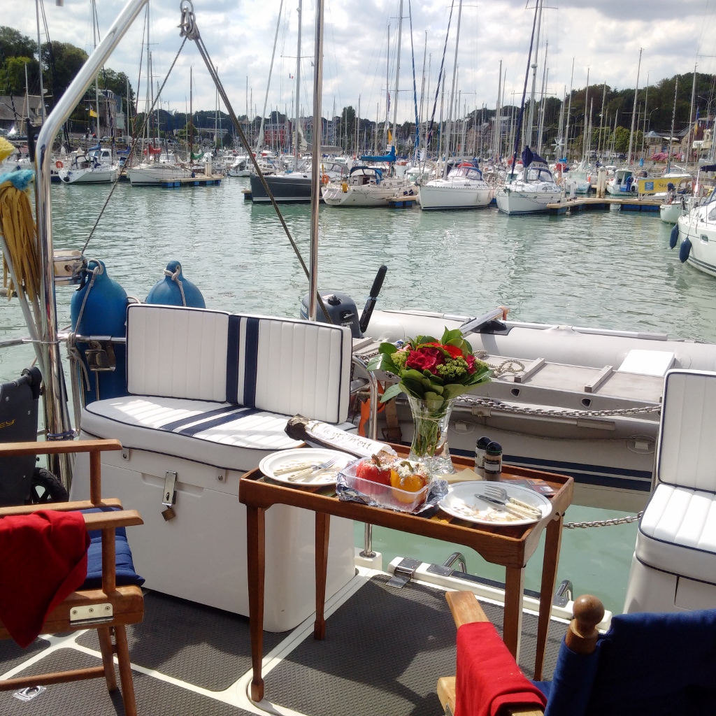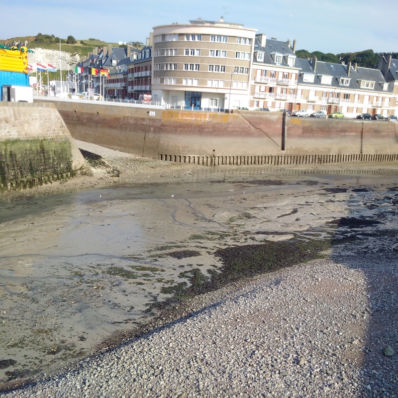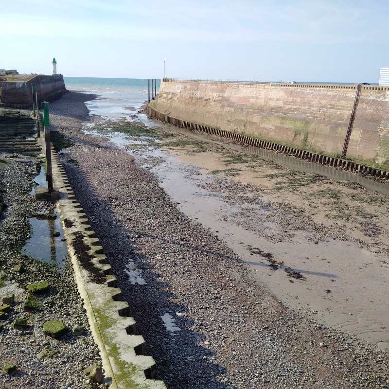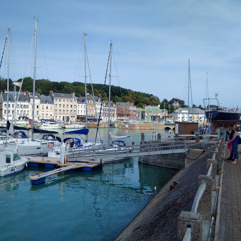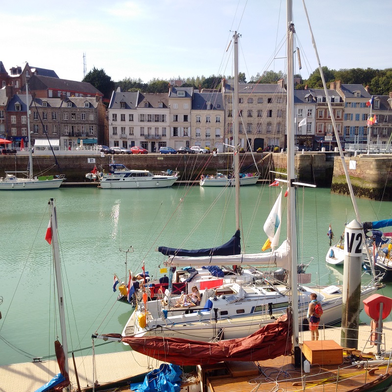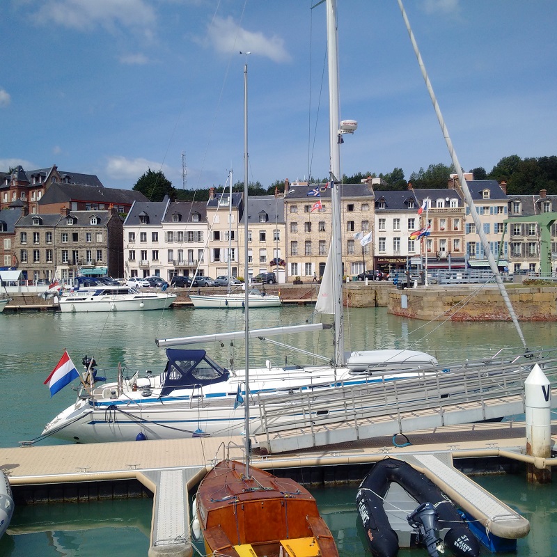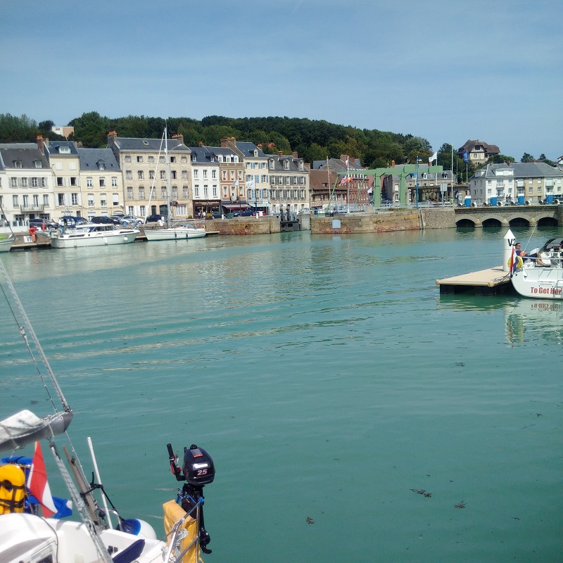 Our time in St Valery-en-Caux was altogether too short and Kathleen pronounced this lovely sheltered and ancient little port the second best venue we had visited after St Vaast-le-Hougue. We certainly loved the market on the morning of our first stay and the walk out to see the dried out channel which was quite spectacular at low water Springs. I took some pictures as a future aid to navigation. The short stay was also enough for me to diagnose an instrument problem indicating a full-deflection reading on my port engine gearbox oil pressure and it turned out to be a broken wire which I then fixed.