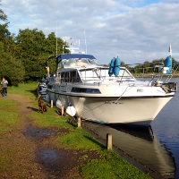 The first day of the second cruise started off in exactly the same way with my Son Daniel and grandson James enjoying the same opportunities and with us having the same result with regard to moorings. We turned back down the Bure and then stopped for a walk around Great Hoveton Broad nature reserve but could not stay long as they would not let our dog Max ashore. At their suggestion, we cruised over to Salhouse Broad and moored up alongside and paid their fee for the night. There was some discussion about us not mooring stern-on but it was quiet anyway and I offered to allow other large private cruisers to moor alongside if necessary and that was more than enough to reassure them.