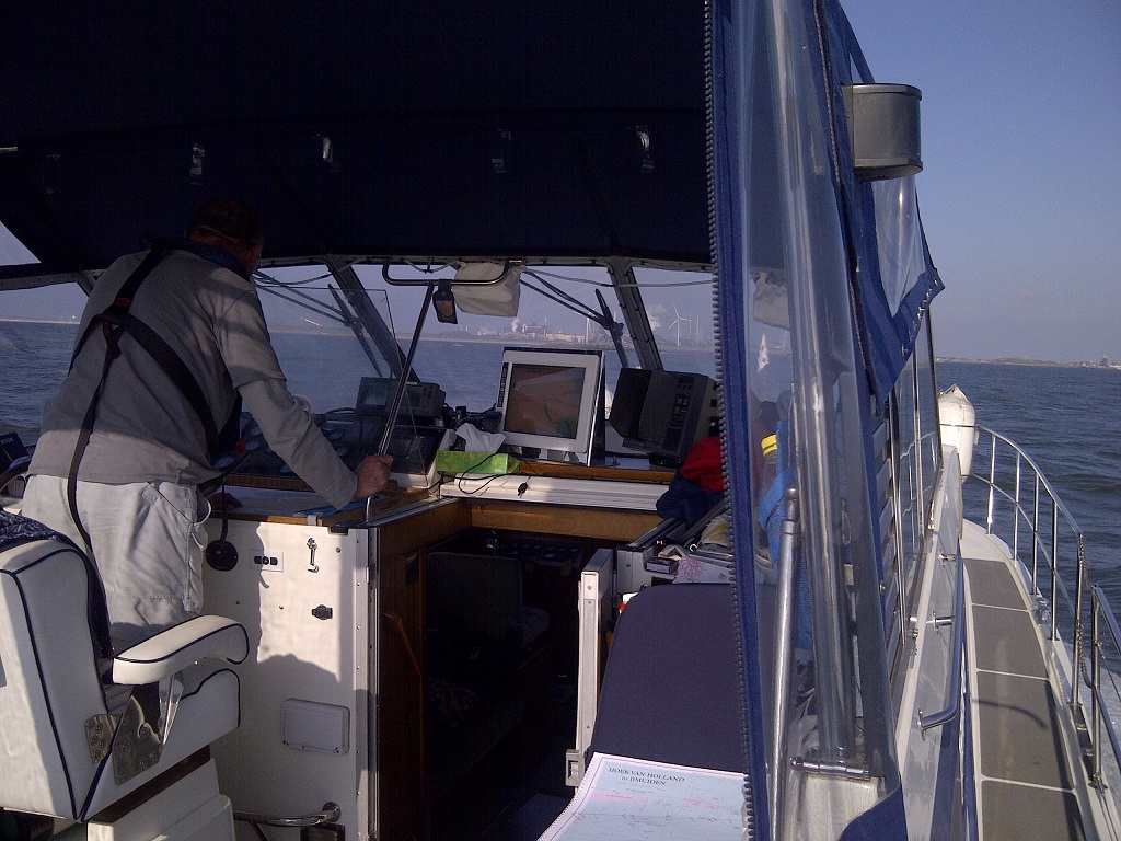 I had completed the engine checks again for safety and then we pulled out of Lowestoft around 06:15 local time and then, just clearing the breakwaters before dredger Orca came back to work, we set a course due East for The Netherlands. I decided upon the following plan of action to further minimise fuel consumption: A technique often used by slow-moving sailors crossing the English Channel, I set a course by autopilot dead reckoning without constant cross track error correction that would occur by having the autopilot navigating between waypoints. The strong flood tide carried us far further south but then the ebb tide corrected us and so we completed a perfect ‘sine wave’ course track that made best use of time and fuel. Our passage also took us well south of the Ijmuiden approach shipping lanes, threading us between their anchorage and the nearby wind farm and we then made a VHF radio call some 3nm out and had clearance to enter the port.