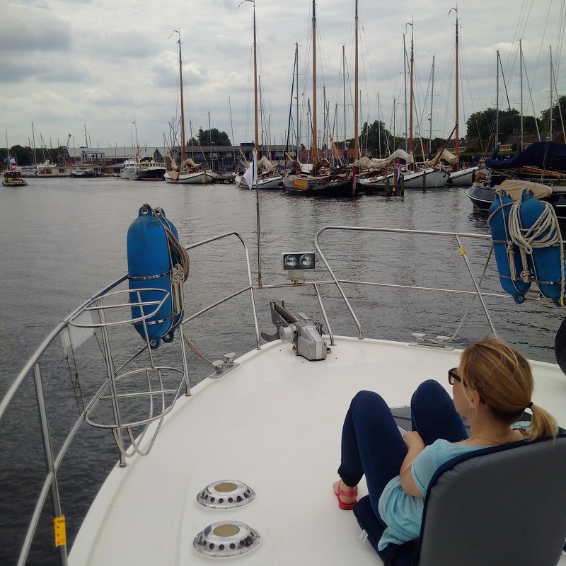 On approaching the Orangesluis I had to wait for the next lock and then a host of other craft arrived and the sluis-watcher had to use his loud speaker system to move everybody forward. The cruise from Orangesluis along the Buiten IJ channel and out into the Markermeer was very straightforward and calm and so I got Sarah up to the helm and gave her some training as well as making sure she was occupied, distracted and scanning the horizon which is the accepted way of avoiding sea-sickness for those who are susceptible.