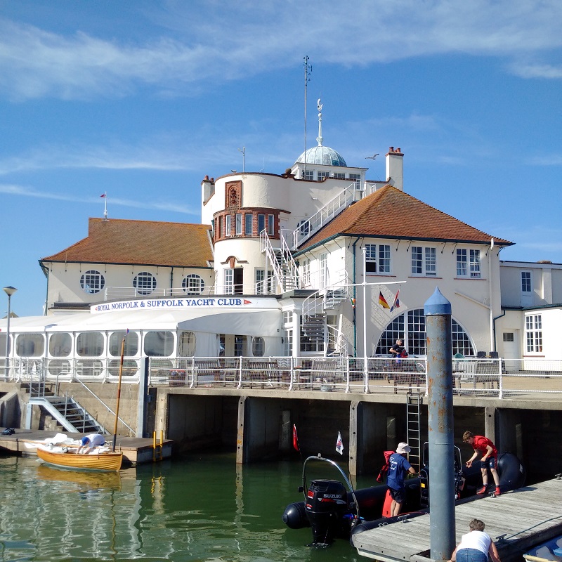 I slipped into the Royal Norfolk and Suffolk Yacht club marina and telephoned for permission to moor and was advised to raft up on the visitor’s pontoon and I spotted a newer-style Broom 42 and easily tied up against it. The owners were not on board and had left chains up on the walkways and an obstruction on the forw’d deck but I had the club's permission to raft up and so pressed ahead, got the hose and proceeded to get the ladies to scrub the boat as I supervised the rinsing hose.