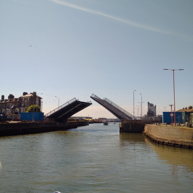 And so, around 2.00pm, I started the engines and then cast off and made my way into the bridge channel to await the others. Unfortunately, we were then ‘descended upon’ by numerous 12ft International clinker-built gaff-rigged sailing dinghies who were having a rally and I was left alone in the channel for some time waiting for them to clear the harbour. Eventually the other craft joined me and, once an old MTB and two sailing vessels had cruised downstream under the bridge and past us, I led the fleet into Lake Lothing and up towards the railway bridge and Mutford Lock.