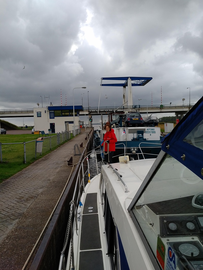 We ploughed on, Lady Martina being more than capable of shrugging off such conditions and eventually the open lake narrowed and we started approaching the Nijkerksluis but were arriving a good ten minutes and one nautical mile behind the 'Neptunus', which had overtaken us rather grumpily. I was monitoring VHF channel 18 and heard his call and the response from the sluis and so I called and announced my approach ten minutes later and this led to the sluis-keeper waiting for me which was very helpful.