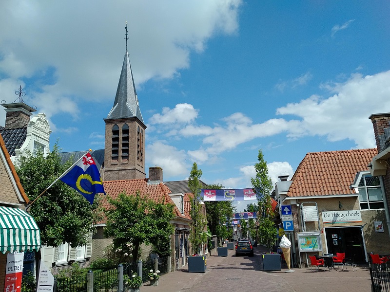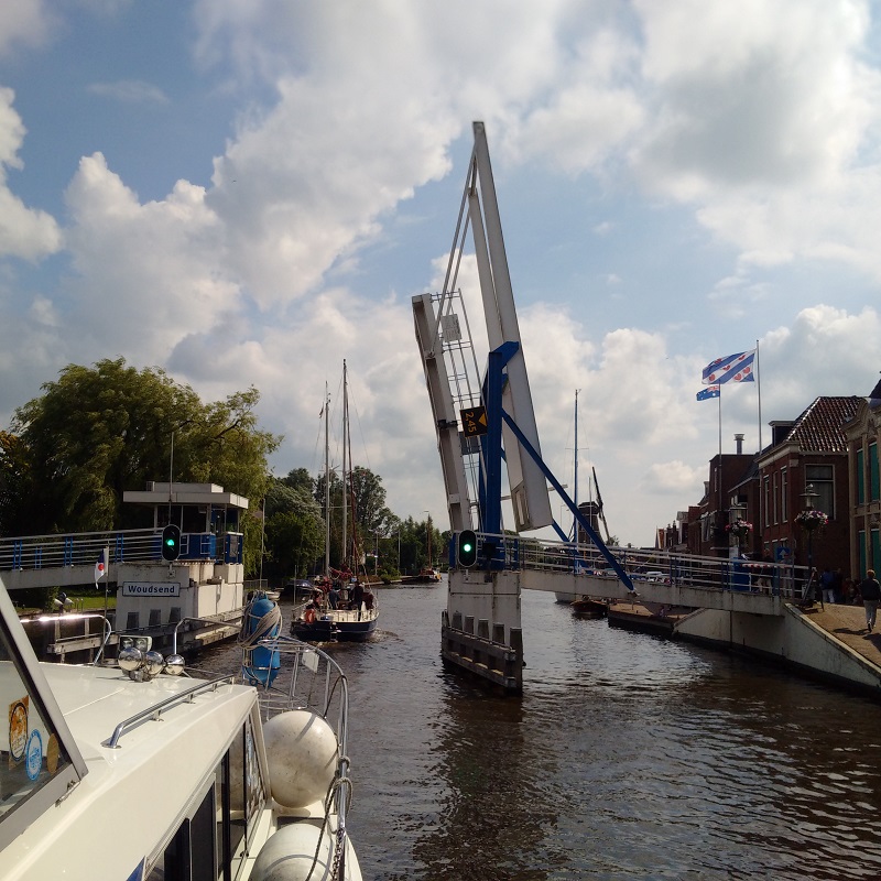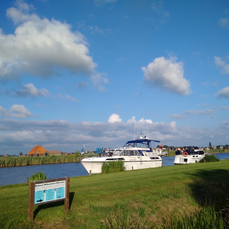 As Kathleen was organising the washing and cleaning the inside of the boat, I took a walk to the centre of Heeg, which is well-served with restaurants and bars, but the shops were mostly closed, it being Sunday, and so I could find no bread to buy. Once back, a further half hour cleaning the hull, as I could reach the starboard side for once, and then we left for the second half of the day’s cruise. This involved cruising south across the Hegermeer and Slotermeer in that fresh breeze and passing through the little village of Woudsend in between before cruising into the sheltered Slotergat, where we found grassy moorings just out of the town of Sloten with 10A electricity and WiFi to make us comfortable for the evening.