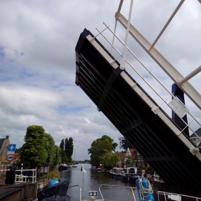 We found ourselves in a convoy and so I adjusted our speed to keep it together as I lead them through three lifting bridges to approach IJlst. There was then the railway bridge at which we pressed the button and then called the bridge-keeper on the quoted mobile and learnt that they would swing in 6mins. They were true to their word and we went through this bridge, turned left into a wider section and then got the Ophaalbrug into IJlst to swing and then proceeded through.