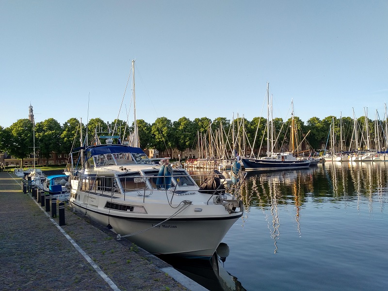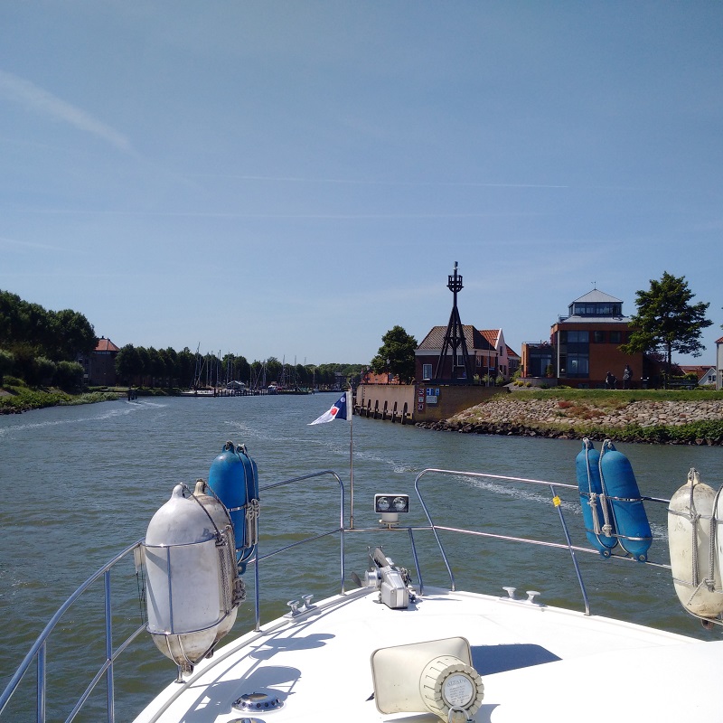 We managed Lady Martina’s cruise into the exposed part of the Ijsselmeer and round the coast from Enkhuizen to Medemblik in a Force 4 with wind speeds up to 15 knots in a beam sea. I had checked the weather in the harbour office and also on-line and we were expecting Force 4 winds of 10-15knots from the north-east and so I was going to treat this trip across the Ijsselmeer as a sea trip and make the necessary precautions accordingly. This meant dropping the folded bikes through the forward hatch on to the bed for safety and rolling up the sun ‘porch’ canopy as well as stowing all fenders and ropes, securing windows and removing everything from surfaces.