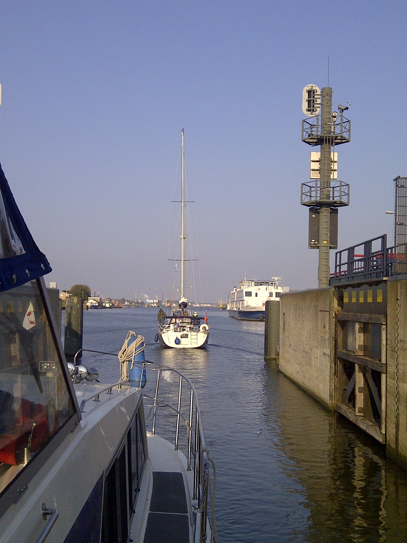 I navigated us past the popular but expensive SeaPort marina up to the Kleine Sluis. The sluis did not answer my call on VHF22 but I moored behind two other waiting boats (a German and Dutch sailing yacht) where we waited for forty five minutes for the gates open when we were quickly through. By this time, we were very tired and anxious to stop and rest and so I took us down a ‘side-canal’ and past the heavily commercial port of Beverwijk where we found that the port were in the process of constructing visitor moorings at the far end and so we went alongside, moored up and were soon ready for bed. We just had the energy to use the hot water to take showers before turning in for a well-earned sleep.