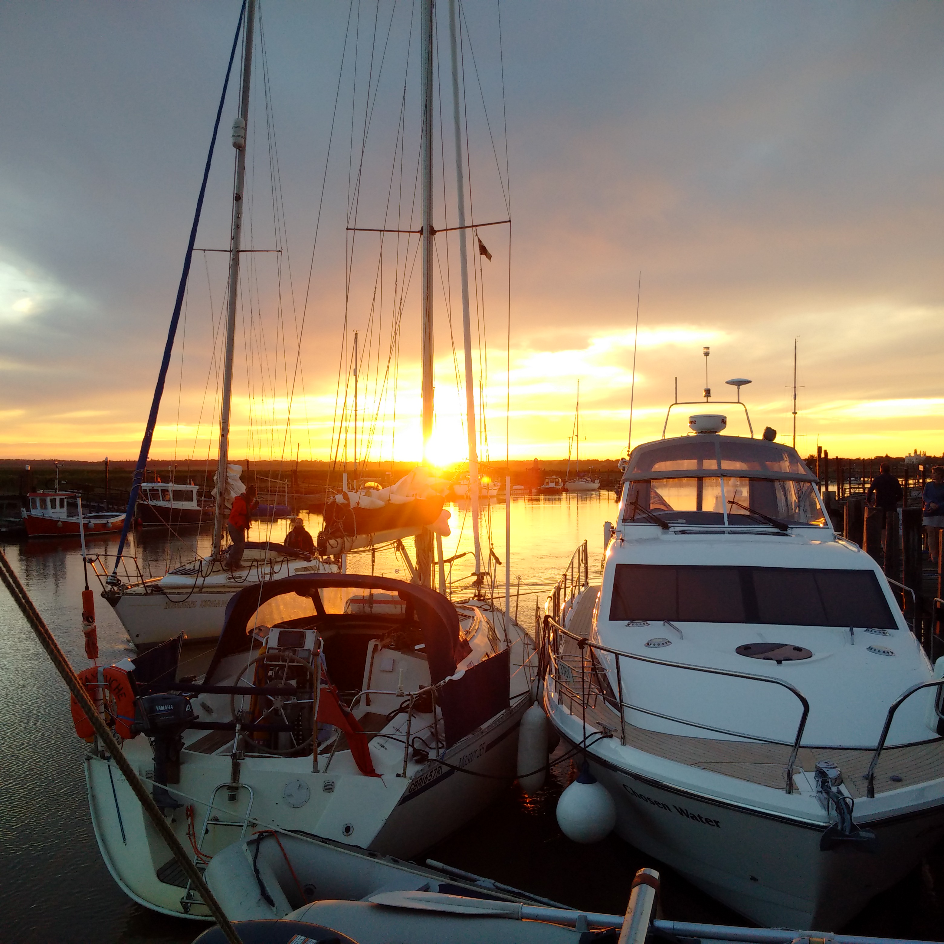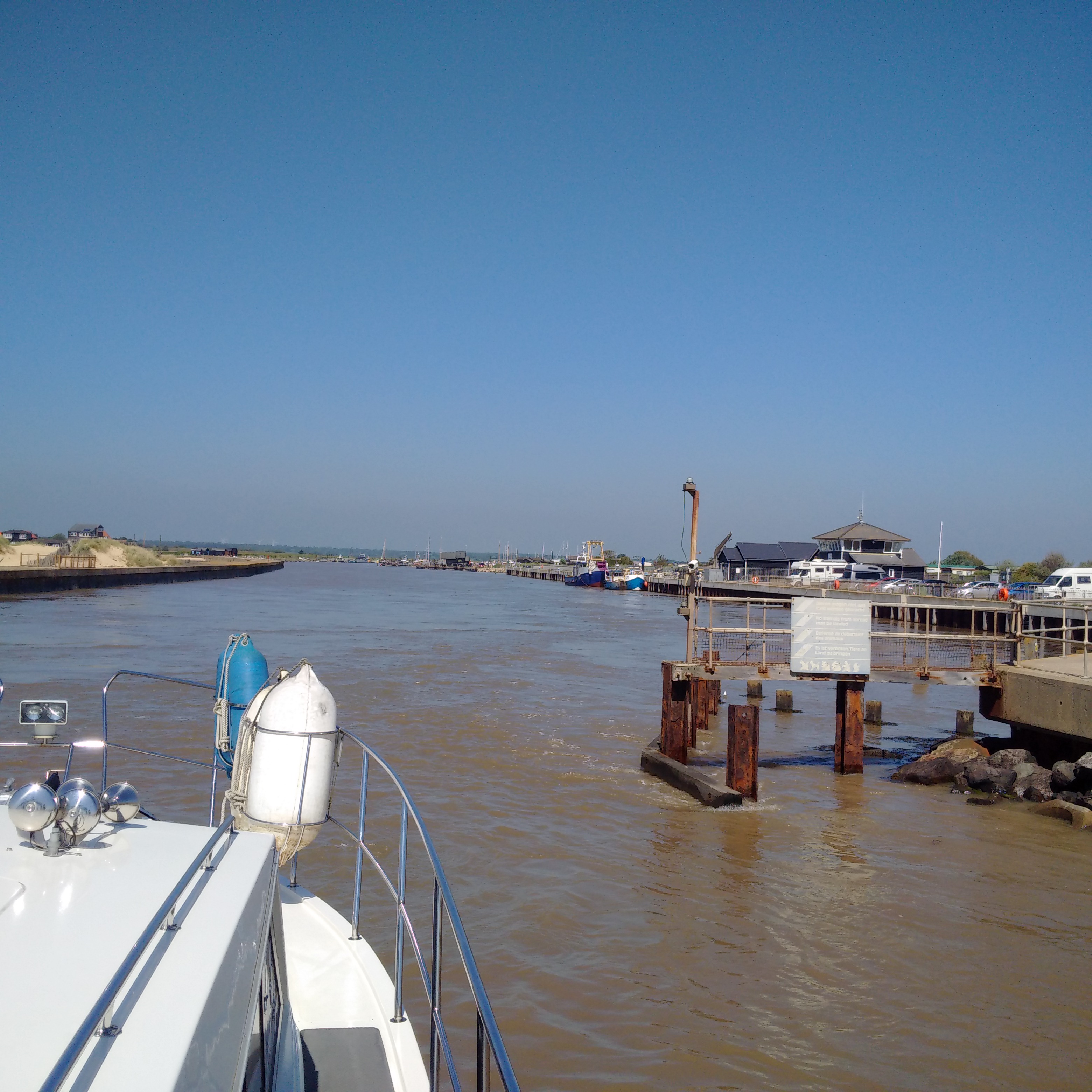We had heard from our Broom colleagues that they had changed their plans and were cruising direct to Woodbridge today and possibly calling in to Southwold on the way back but we had booked the moorings at both places according to the former plan and a direct passage to Woodbridge would have had us arriving very late on the tide and so we let them go alone. The other consideration was that we were making our way down the coast and so cruising directly to Woodbridge would mean not calling in at Southwold at all and I had never been in there. Our passage today took us out of Lowestoft on the 9.30am bridge lift and then allowed for a 10knot leisurely cruise down the coast for an hour or so and then entry half an hour before High Water and, for a new port on a Spring Tide, that suited us just fine. It was a little breezier than the last few days and it was onshore from the east, but it was only 10-11 knots and very manageable giving slight seas and so the passage was a joy. We approached Southwold Harbour entrance on the 320 bearing recommended and our waypoints took us right there. I kept sharp right and close in around ‘The Knuckle’ and then made my way upstream with a 2kn following tide, turning without trouble and coming in to where the harbourmaster was standing and directing me on VHF. He had allowed me on to the ‘pub moorings’ on the true left bank, which had more depth as well as electricity and water, for the new pontoons moorings on the right bank were shoal on Spring Tides. The only downside is that the quay timers are vertical but he had plenty planks on ropes that we were welcome to use horizontally against fenders to help Lady Martina stand-off. It took us a while to get all of the ropes, planks and fenders adjusted but we ended up with two planks, one each correctly positioned for the flood and ebb flows, and then we used the water to wash down the boat and fill the tanks.