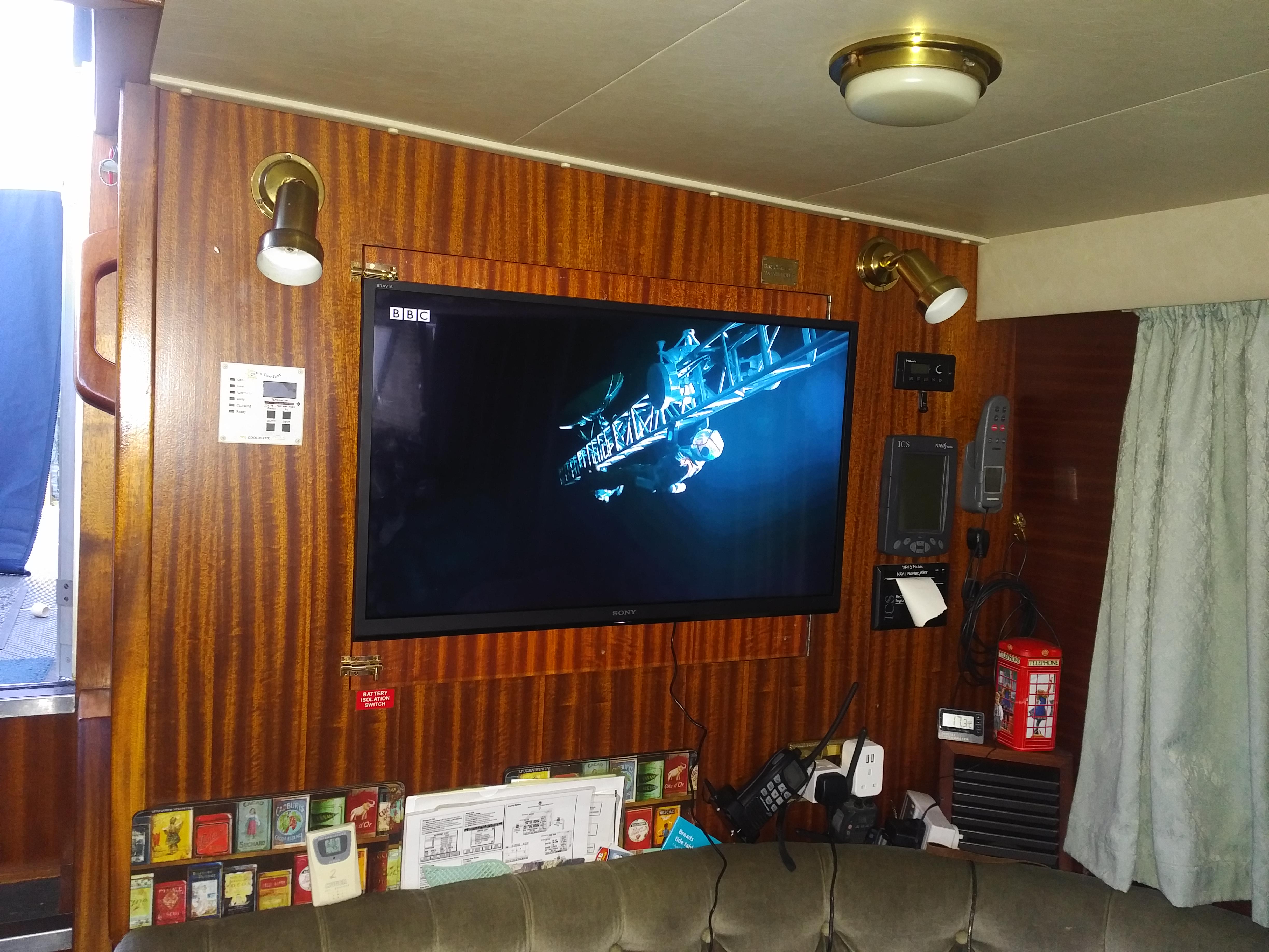 We were able to arrive at Kevin’s chalet and he kindly opened a cupboard so that we could use the shore-power overnight and during the installation the next day. We spend a very pleasant evening in the sun with virtually no wind and even managed to use the Broom Boats Wi-Fi once Kathleen had walked to their yard and secured the code. It was a good reception by very slow service, which was just fine for us.
