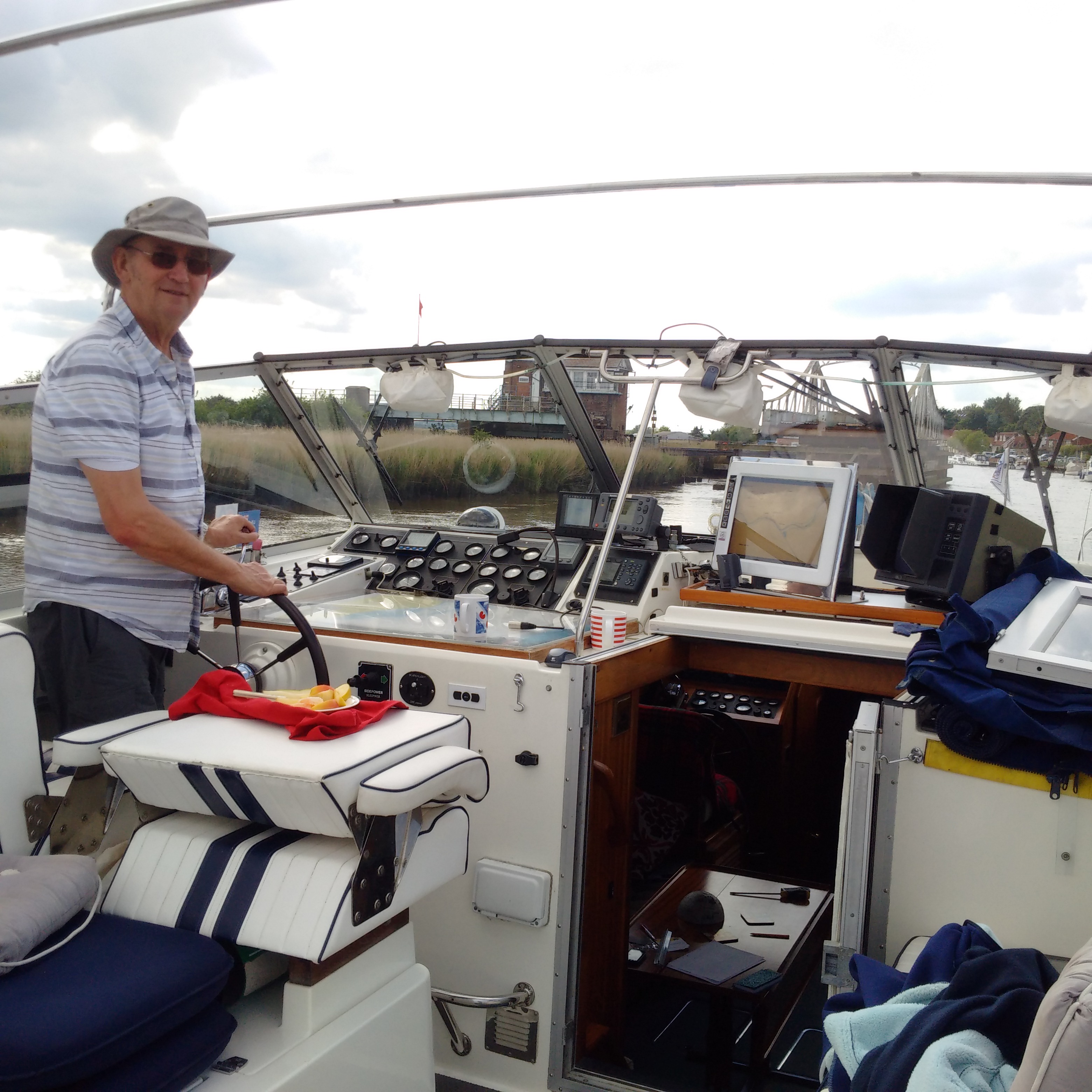 That left the slight matter of navigating down the River Bure to Great Yarmouth getting under the Bure Bridges and then making my way up the Yare through Reedham Bridge. At this point I engaged the help of the Broads Authority rangers at Great Yarmouth Marina and kept checking on the bridge heights as the morning progressed. We arrived there around 1pm and unfortunately the river had not dropped enough and so we moored up for an hour or so and then left when the tide marker was reading about 10ft 3ins. We got under the bridges with more than 4ins to spare which means that anything over 10ft would be good for future reference. It was a lovely calm, warm and bright day with sunny spells and easy to moor at the Yacht Station and then put up or windscreens and radar mast whilst we cruised on autopilot across Breydon Water. I opened up the engines and made more than 20knots through the water (17 over the ground with an adverse tide) with near-maximum revs and some vibrations. This confirmed my preference for cruising at a slower and more economical speed.