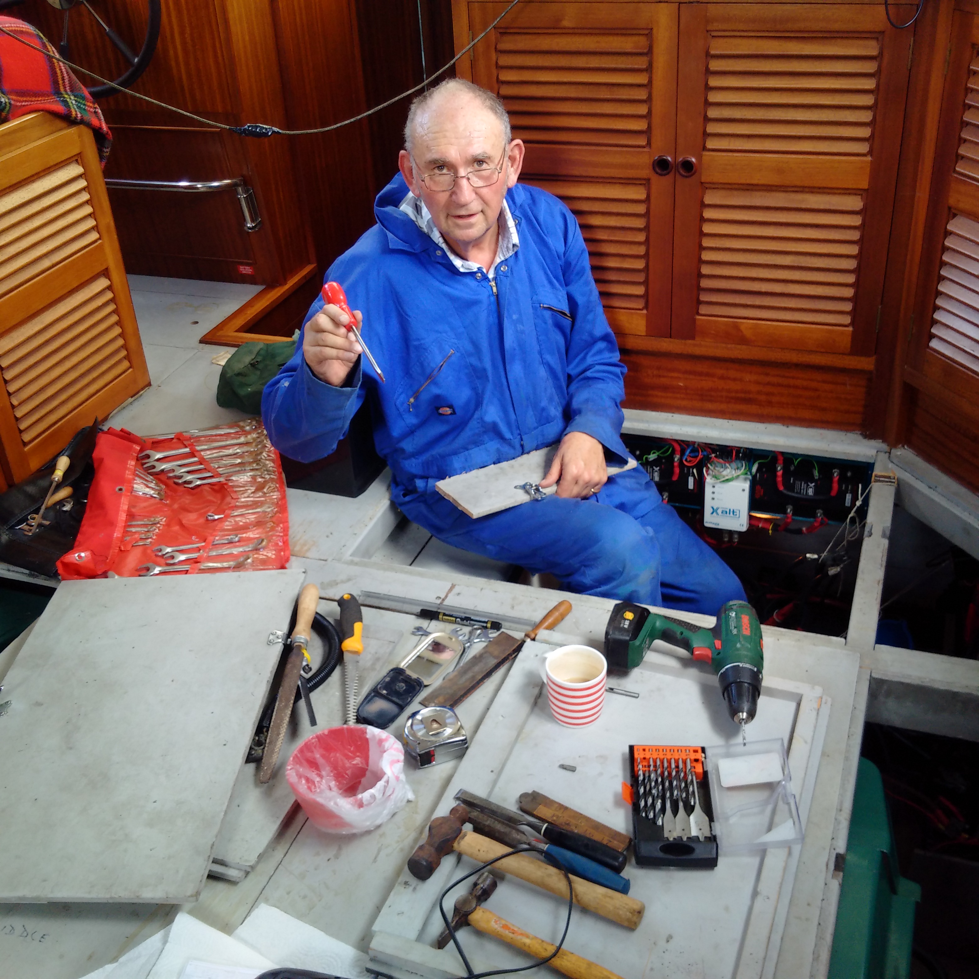 The Preparation - Kevin Peachment came up with two higher-capacity battery options, one of which at 220AH was just too wide for our battery bays but the other, rated at 200AH, was reasonable narrow but just a little too long. I worked out that by just extending one 40cm edge of the battery compartment by less than a centimetre, I could just accommodate a 200AH version which, with four installed in serial and parallel, would give us a theoretical 400AH at 24volts. Kevin got these on order for me and kindly offered me the opportunity to moor up at his riverside chalet opposite his works for the night and to perform the battery swap the next day.