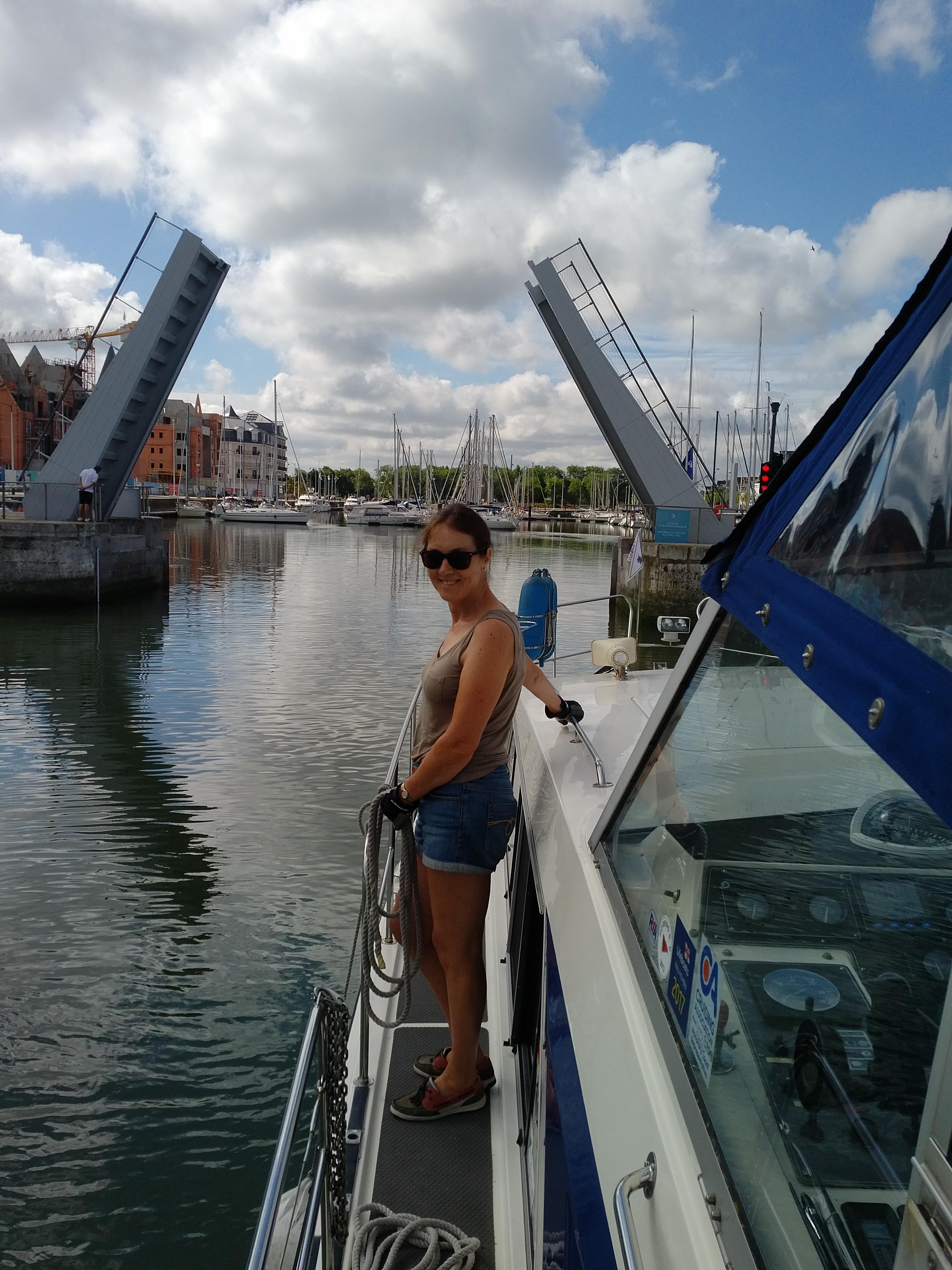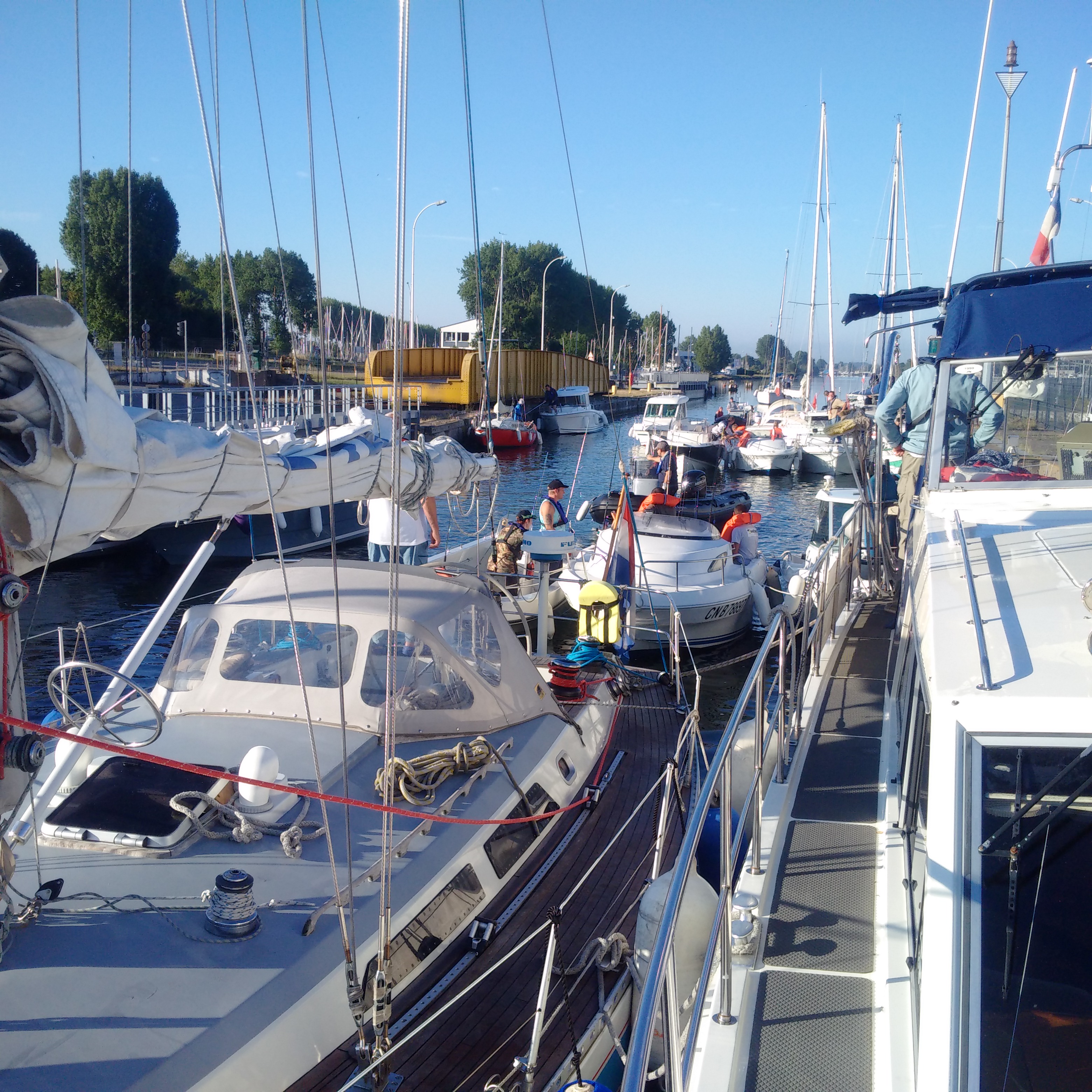 We were hardly alone in that 8am lock out from Ouistrehem to the sea as there were nearly 40 boats that joined us in the lock and then formed a huge echelon when the exit gates opened. Before this, we held our own, found a mooring in the lock and allowed another large Dutch boat to come alongside. Having dropped around 1.9m to sea level the other side, we left the lock and had lots of boats speeding past us; competing for the best fishing spots to the north-west of the port and they made plenty of wash whilst doing so, which made it quite exciting for Kathleen.