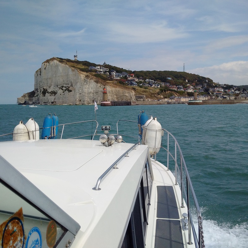 We had a great cruise from Le Havre to Fecamp ; arriving in the harbour at exactly the right time to cruise through the bridge and open barrier to moor in the sheltered Bassigny basin and there to find the town en fete with its annual Fecamp Motor Team rally of thousands of motorbikes descending from the mountain and parading through the centre in a wild and spectacular procession with lights and horns blazing. It was a magnificent sunny and warm day and still later in the evening for the event but the winds at sea were an unexpected Force 4 which, against our following tide of over 2knots, made for a moderate sea at times, though it was smooth and slight at others.