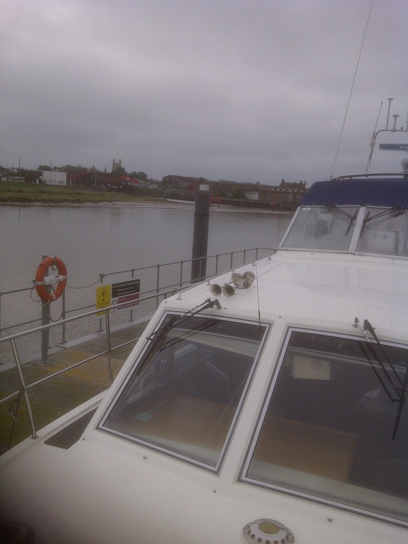 In the failing light, we cruised around the navigation markers and managed to get a rope on to one of the pontoon stanchions despite the strong tide and then got three more ropes on eventually to moor safely for an overnight stay. There then followed the long process of raising the windscreens and mast, erecting the canopy and adding the side screens and rear screens such that it was approaching midnight by the time we had mopped up the damp and put Lady Martina in good shape for the night. I had planned our sea passage for tomorrow and had already checked Lady Martina for seaworthiness and preparation ready for our 10.30am, Haven Bridge lift in the morning