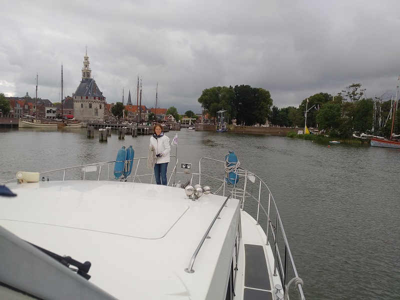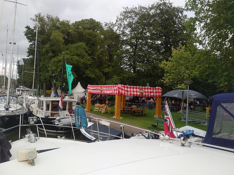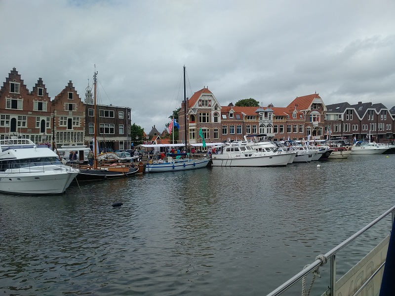 After two days in Enkhuizen, we set off at 8.30am, as soon as the Drommerdoris Bridge opened and could be radioed on VHF channel 12 and then we approached the Naviduct Krabbersgat and moored up until they locked us through with a few other vessels. Having left the Ijsselmeer and joined the Markermeer, we cruised closely and steadily around the Appelhoek and De Kleiput headlands until we approached Hoorn. We entered the Binnenhaven to find a used boat show along the main quay and a special festival on the grassy north bank, but we first moored up for free water before rafting up with Ikon.