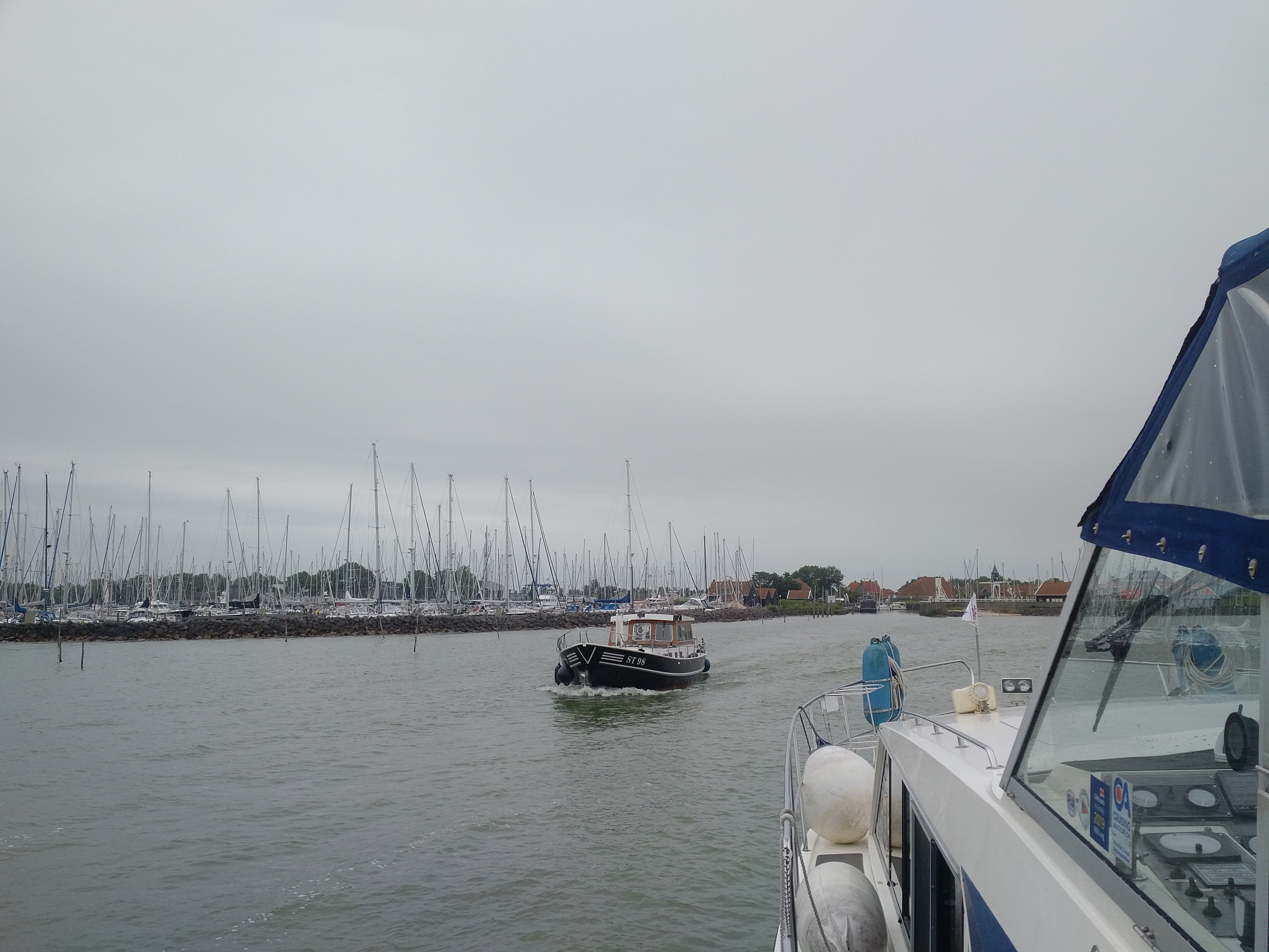 I had been doing some essential and overdue writing this morning, since about 7am, and then, having called Kathleen at 9am and sat together until nearly 10am, I was not really ready to prepare Lady Martina for another sea trip. I was also hungry and so Kathleen to make us both some porridge for breakfast, which we were enjoying when the others were ready to go. Once that was finished, I felt it necessary to check the oil and water levels of Lady Martina’s engines so as to take no chances. The slight rain was falling with a moderate breeze and, as I had said in my morning radio message to Chris on Ikon, you cannot take the IJsselmeer for granted and we would not have been able to cater whilst underway.