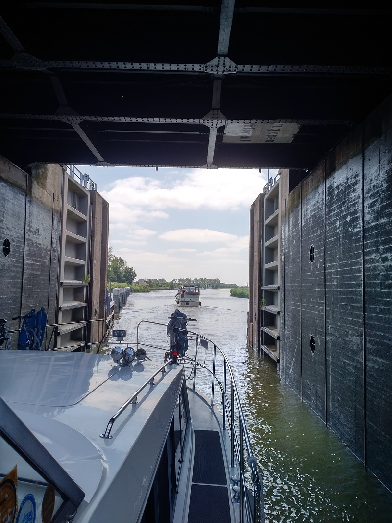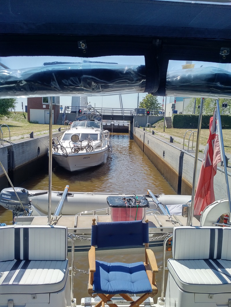 We then dropped a massive 6 m down via the Noordersluis lock and then into the Lage Vaart, along straight waterway which boasted some 16 bridges, all of 6 to 7 m headroom, which was very convenient for Lady Martina and Ikon. All of this time, we were following a Dutch motorboat which seem to take pains to stay ahead of us so that when we eventually got the to the two locks providing access to the Ketelmeer, they were closed on us and we had to wait a complete cycle for them to be available again.