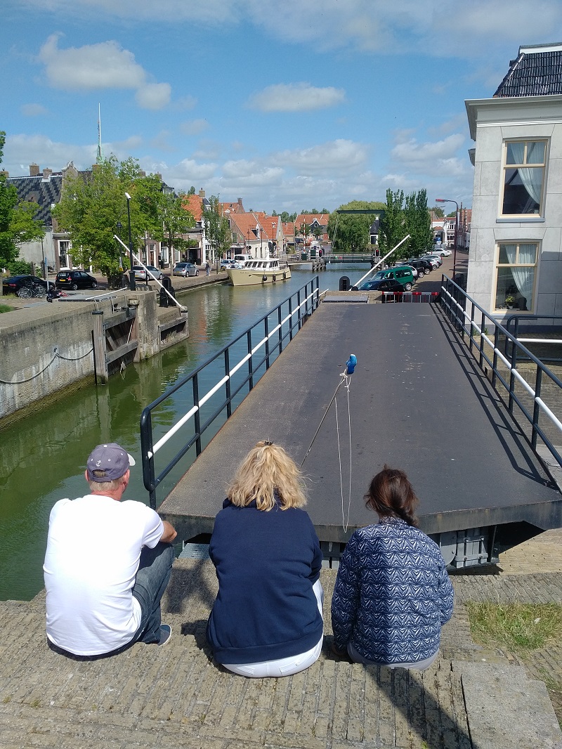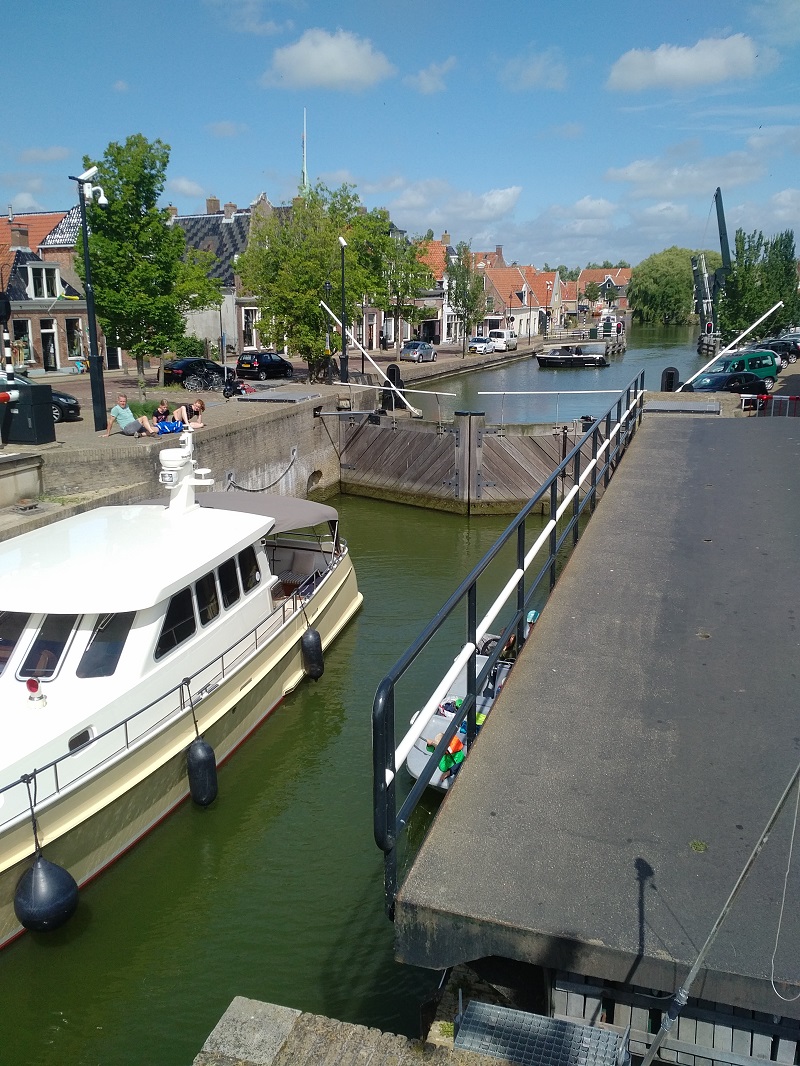 The nearest bridges, of Noarderbrege and Sudergoabreg could be negotiated satisfactorily but once we turned into the Workumer Trekfeart, in a convoy of four boats, it was after midday before we arrived at the Nijhuizumerbrug. By this time, the bridge was showing two red lights and had closed or ‘paused’ for lunch for an hour from noon until 1pm. After this delay, we continued through the Workumer Trekfeart and then we turned into the Van Panhuykanaal at Tjerweed. Finally, we passed the Allingawiesterbrug and Hemmens Brege bridges, before approaching the Vallaatsbrug bridge and Schutsluis in Makkum.This latter sluis, or lock, was just wide enough to take both Ikon and Lady Martina alongside but not long enough to accommodate any others.