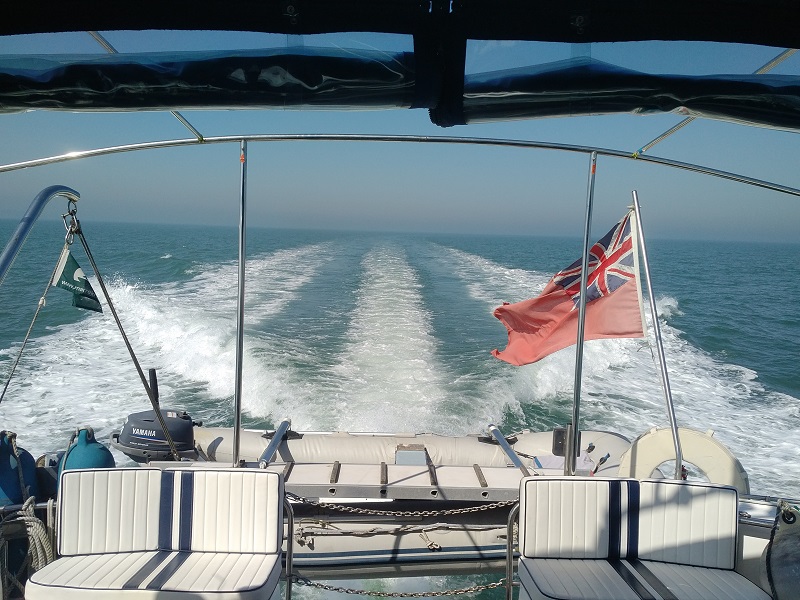In predominantly south-easterly breezes, the Force 4 strength with the following tide of 1 to 2 kn kept the sea state to smooth or slight and, with moderate to good visibility and warm temperatures the cruise went very well. As this was the first test of our hulls effectiveness, following the new antifouling application, I opened up the engines and monitored the speed through the water every 100 rpm up to a maximum of 2600 rpm where the speed was about 19 kn. By cruising relatively slowly at 13 to 1500 kn we kept our speed to around 9 kn through the water, 10 kn over the ground, where we were consuming something like 20 L an hour of diesel fuel. The harbourmaster had left after taking our final call so we were left to choose her own location on the pontoon and complete our moorings alone